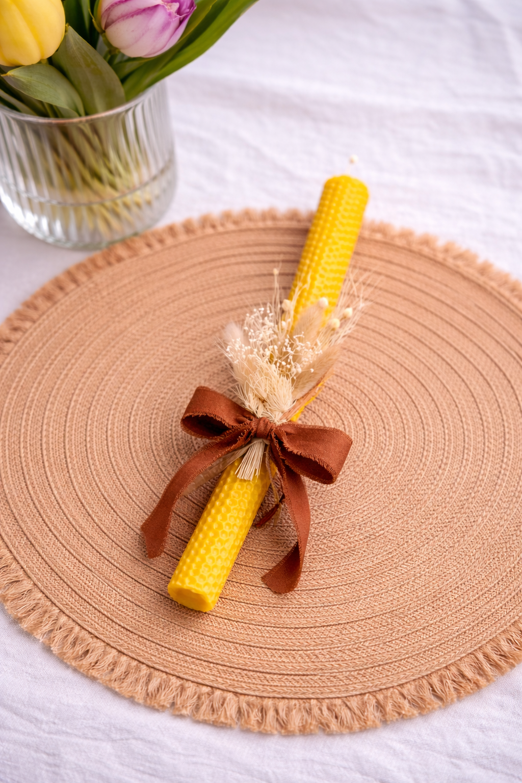 Πασχαλινή λαμπάδα τυλιχτή από αγνό, 100% φυσικό μελισσοκέρι, που διατηρεί το αυθεντικό, διακριτικό άρωμα του ίδιου του υλικού, χωρίς τεχνητές προσθήκες. Το μελισσοκέρι εξασφαλίζει καθαρή και σταθερή καύση, δημιουργώντας μια ζεστή και γνήσια ατμόσφαιρα, ιδανική για τις ημέρες του Πάσχα.